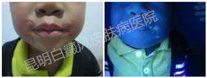 ▲病 史:该患儿2个月前由于长时间双嘴角生口疮康复后嘴角变白,曾到某儿童医院就诊,外涂他克莫司软膏盒一种中成药膏,未有明显变化,遂到我所就诊。>>>孩子的白斑已经发展到什么阶段?赶紧咨询医生,获得正确指导