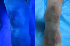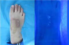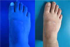 检 查:1、伍德灯:脚背部大片白斑色素脱失100%