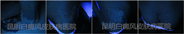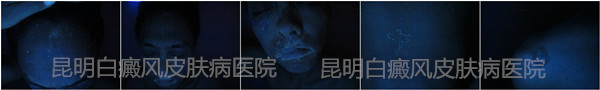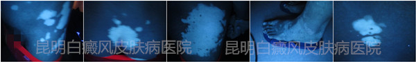1、伍德灯:患者面部、额头等部位白斑色素脱失,界限模糊