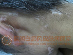 ▲病史:患者章蓉在两年前发现颈部、左耳后出现白斑,曾到当地医院就医,口服过多种药物(药名不详)外涂外擦药(药名不详)白斑慢慢扩大延伸至前鬓角,今来我院就诊。