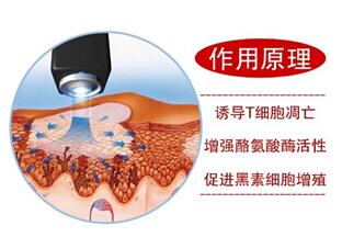 临床研究表明:308nm波长是诱导白癜风皮损中病理性的T淋巴细胞凋亡的适宜波长,也是UVB波段内穿透力较强的波长,深可穿透真皮浅层1.5mm,因此对治疗白癜风有良好的效果。医疗上就是利用这个原理,通过激光直接照射皮损处,使之引起相关的生物和化学变化,从而促进皮肤色素的合成,达到治疗的目的。